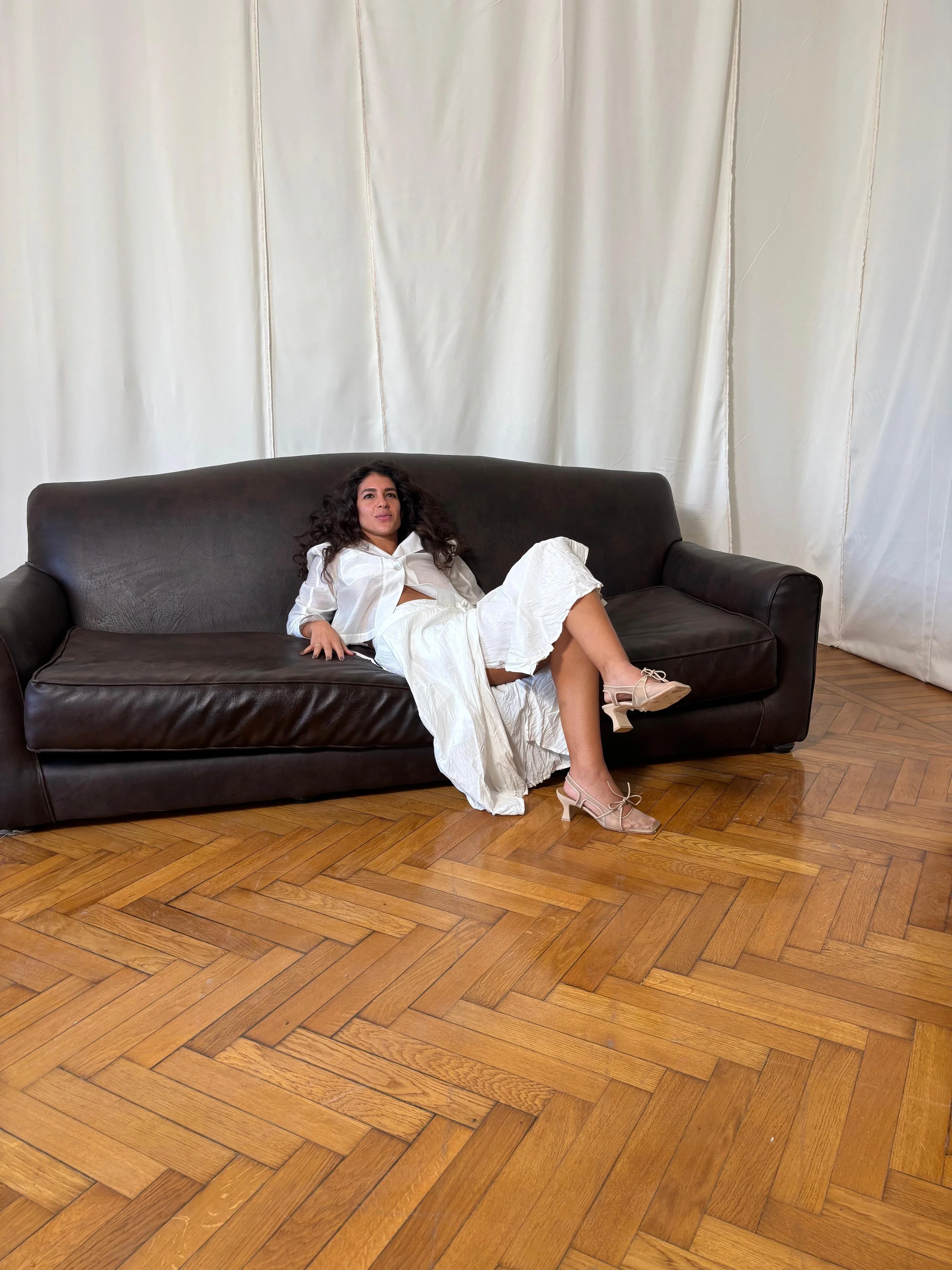 Noura wearing the Ivory Tie Shirt and Ivory Crinkle Wrap Skirt, 2025.